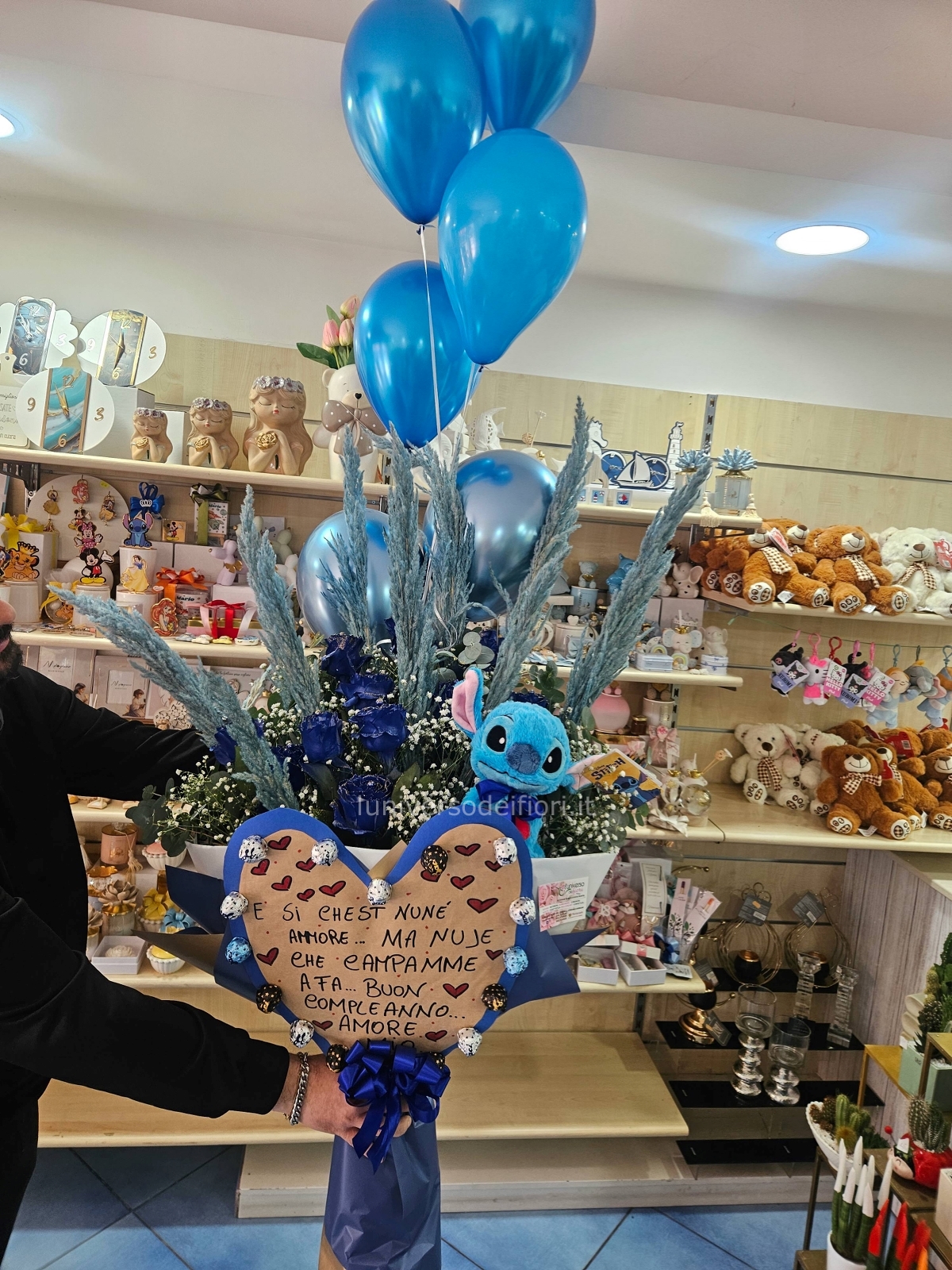 Fascio Stich 11 Rose Blu Peluche Stich Pumpas e palloni elio