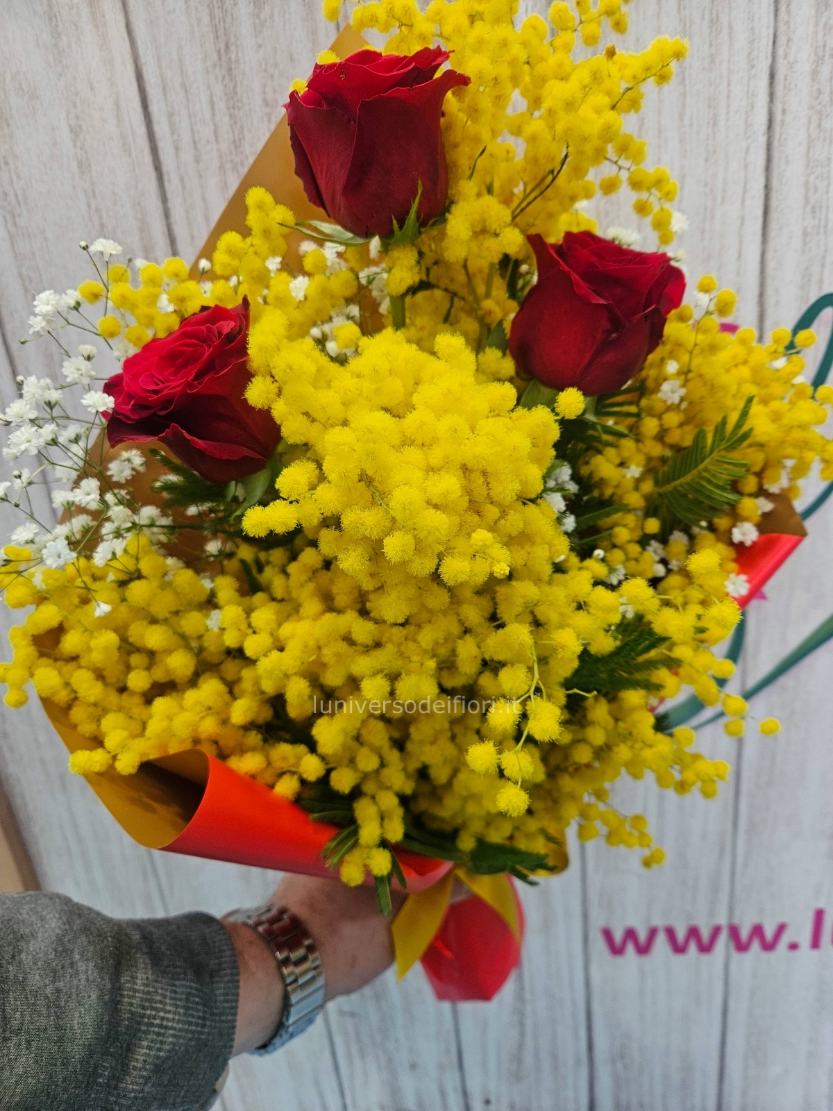 Scegli il nostro fascio di rose e mimosa per esprimere sentimenti speciali, e goditi la comodità della consegna a domicilio in tutta Torre del Greco.