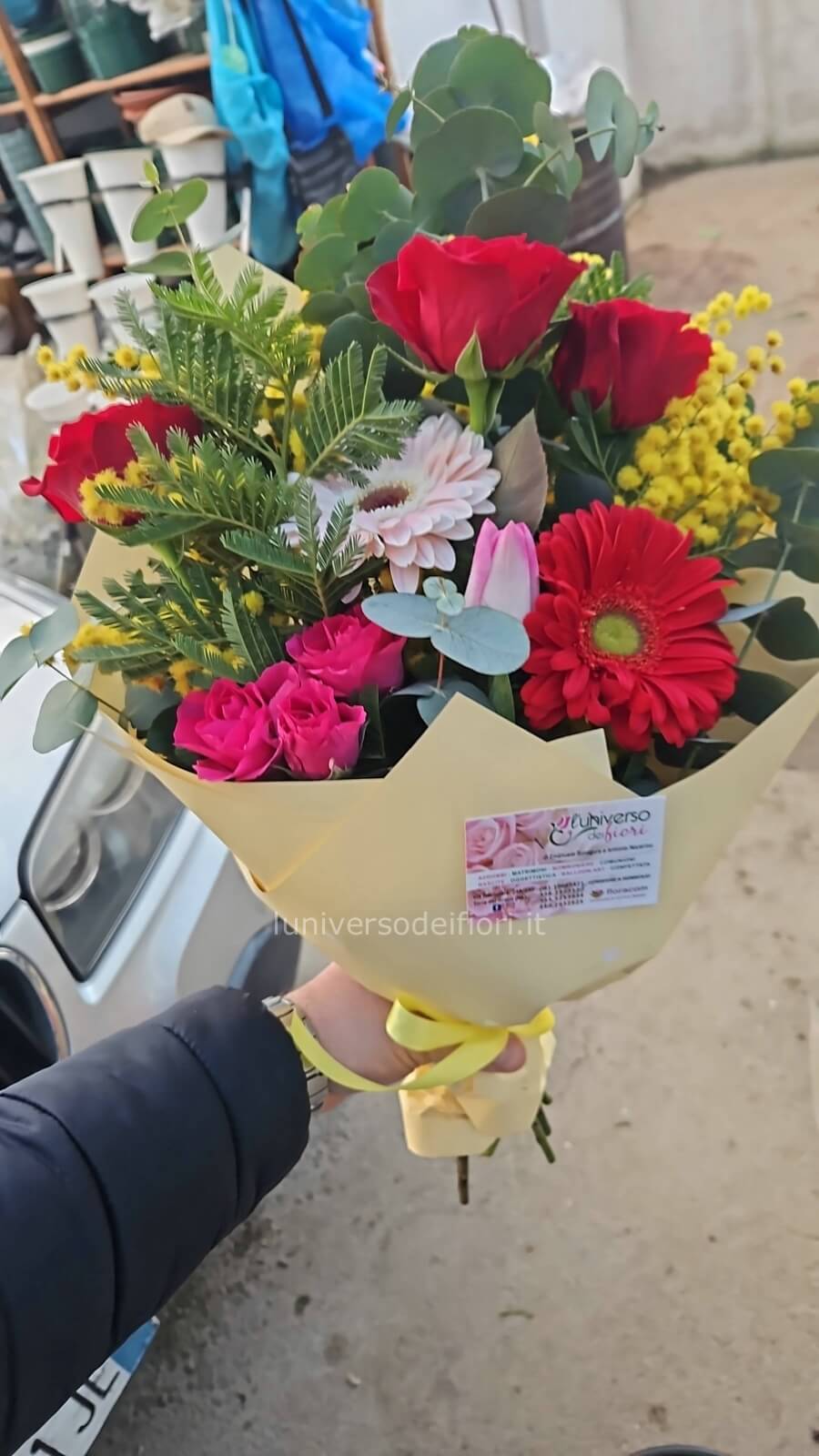 3 Rose rosse a stelo lungo con mimosa e fiori di stagione