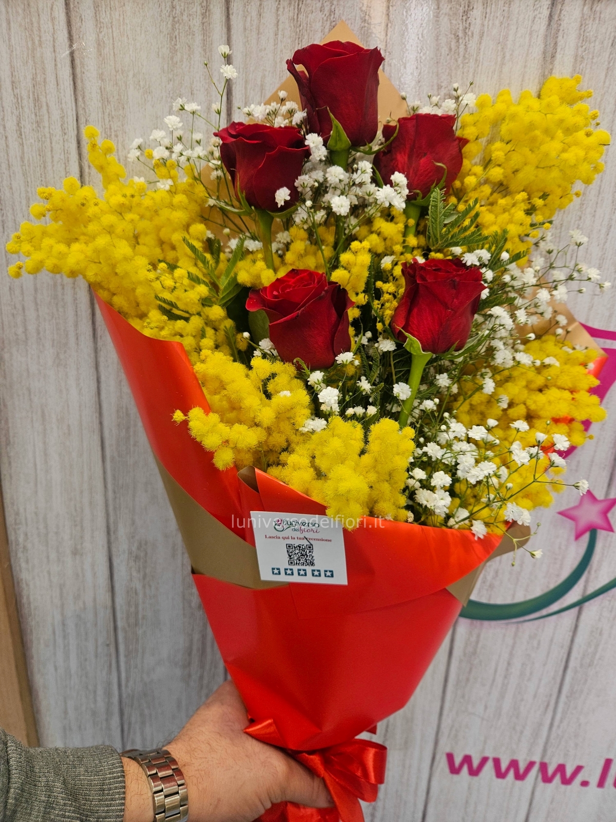 35 euro Fascio 5 rose rosse e mimosa