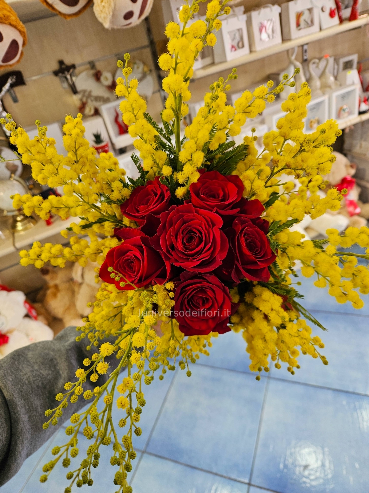 Boquet 25 euro 6 rose rosse compatte e mimosa