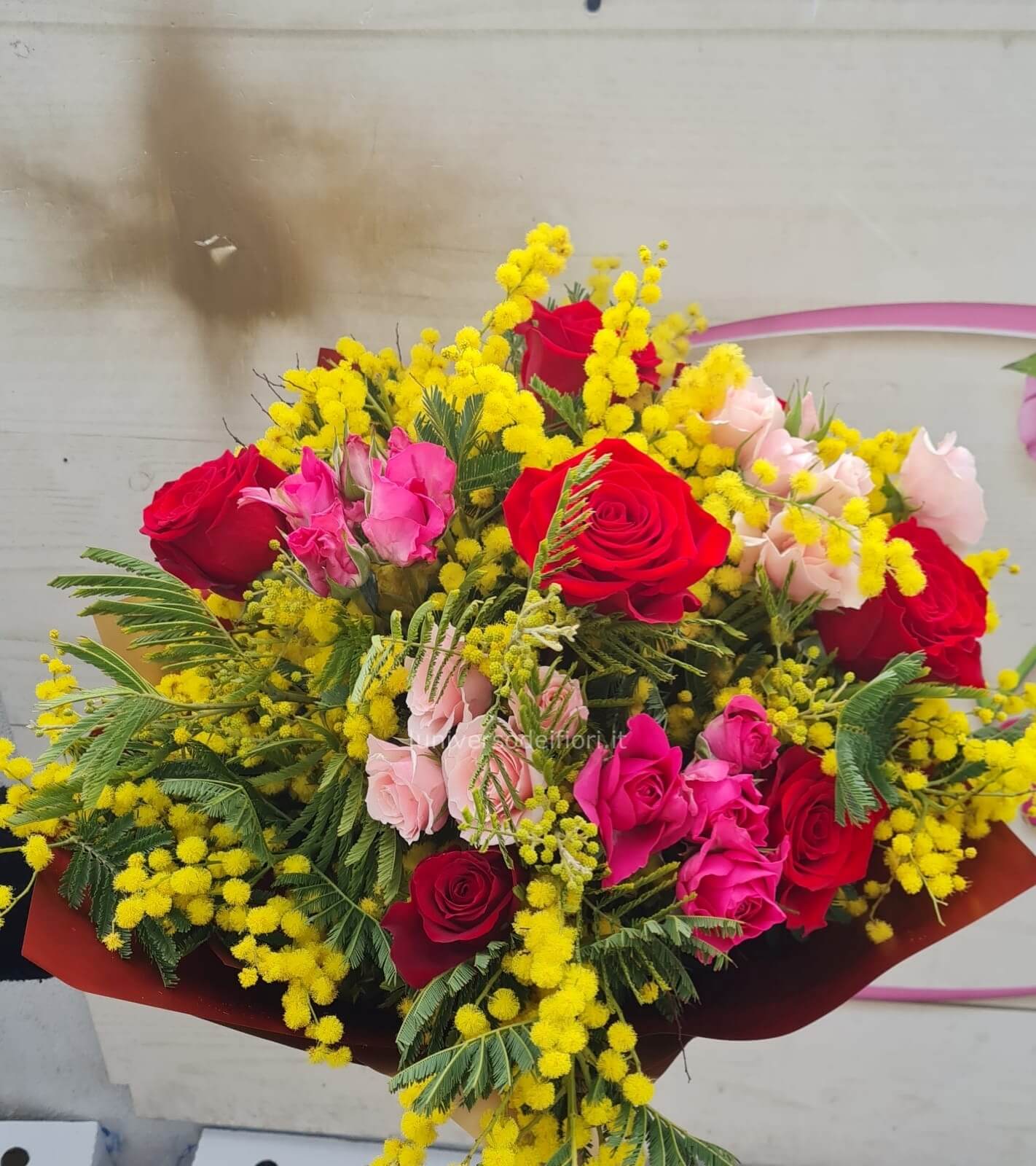 Bouquet di 7 rose rosse mimosa e fiori di stagione