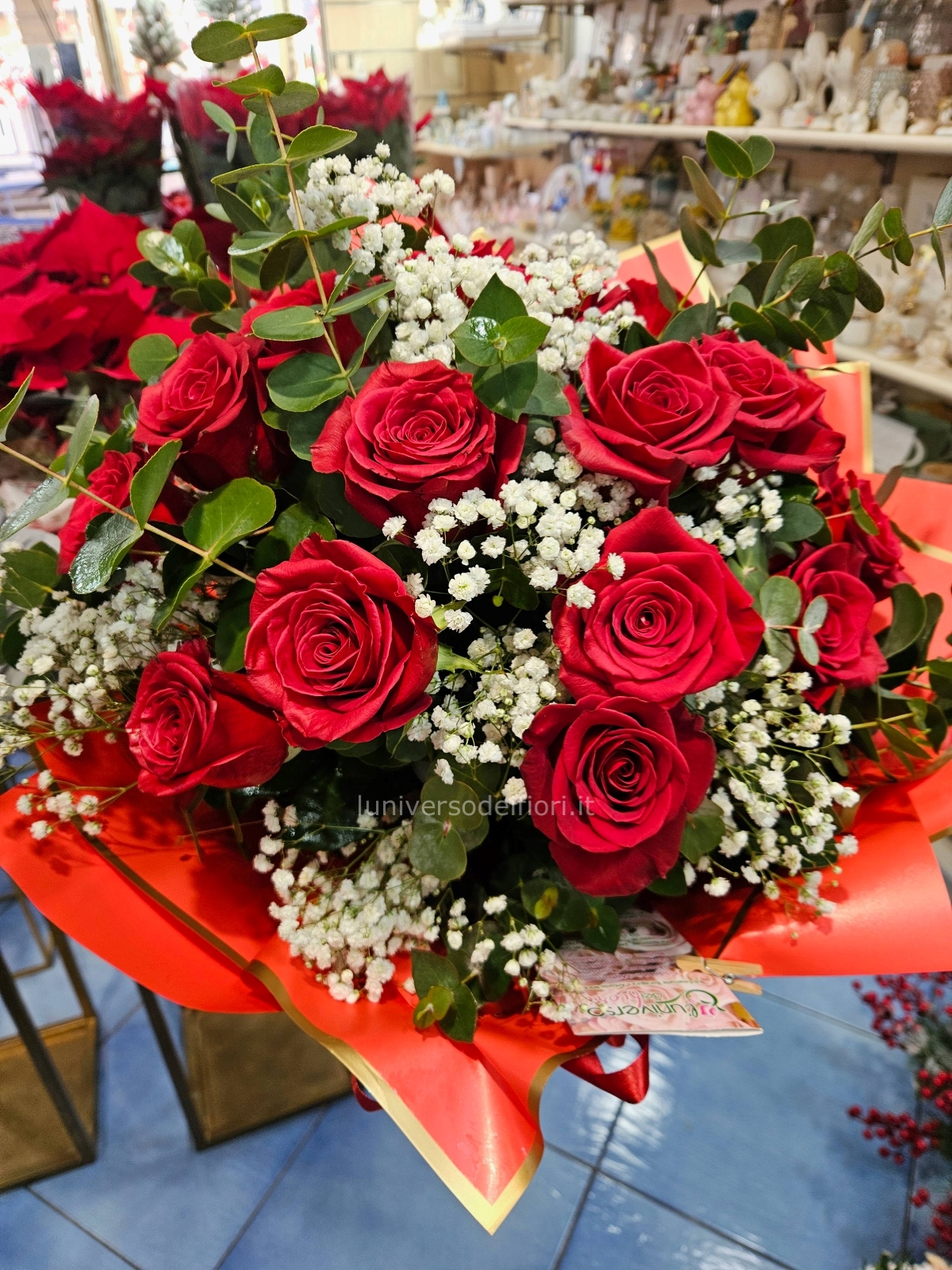 Bouquet rotondo con 15 rose rosse nebbiolina ed eucalipto