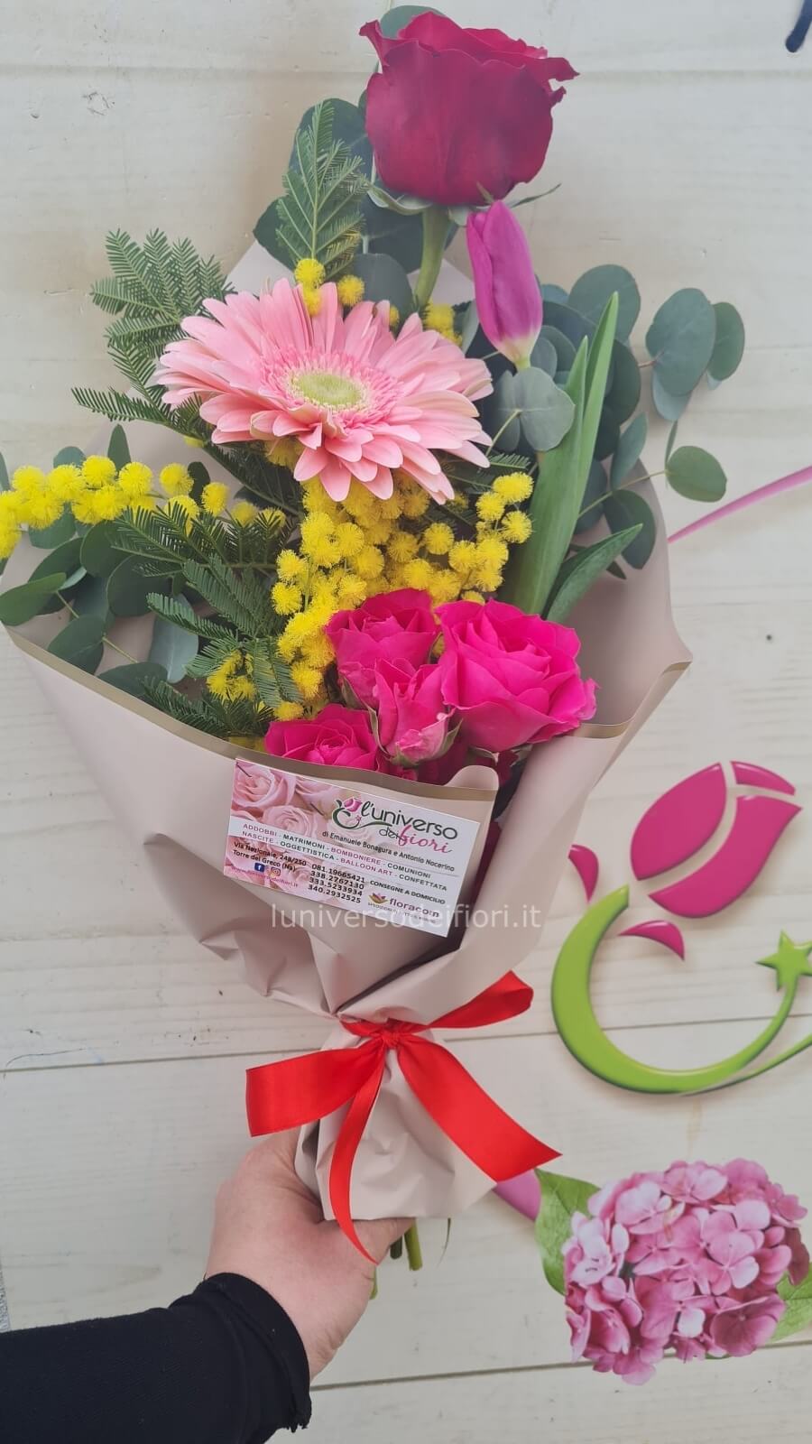 Mazzetto con 1 rosa rossa mimosa e fiori di stagione